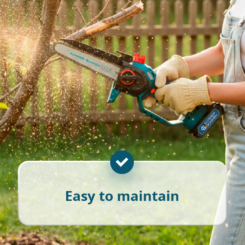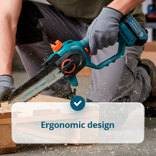 The KS MCS20V-8 cordless mini chainsaw (without battery and charger) from Könner & Söhnen features an 8″ (20 cm) bar and 8 m/s chain speed, making it a reliable tool for garden work. Its powerful brushless motor with a 5-year warranty runs quietly, smoothly, and reliably. The compact body and ergonomic rubber handle provide comfort and control, even with one-handed use. For safety, it features a safety lock, protective guards, and a shield. Convenience features include tool-free chain tensioning, automatic chain lubrication, and an oil level window.