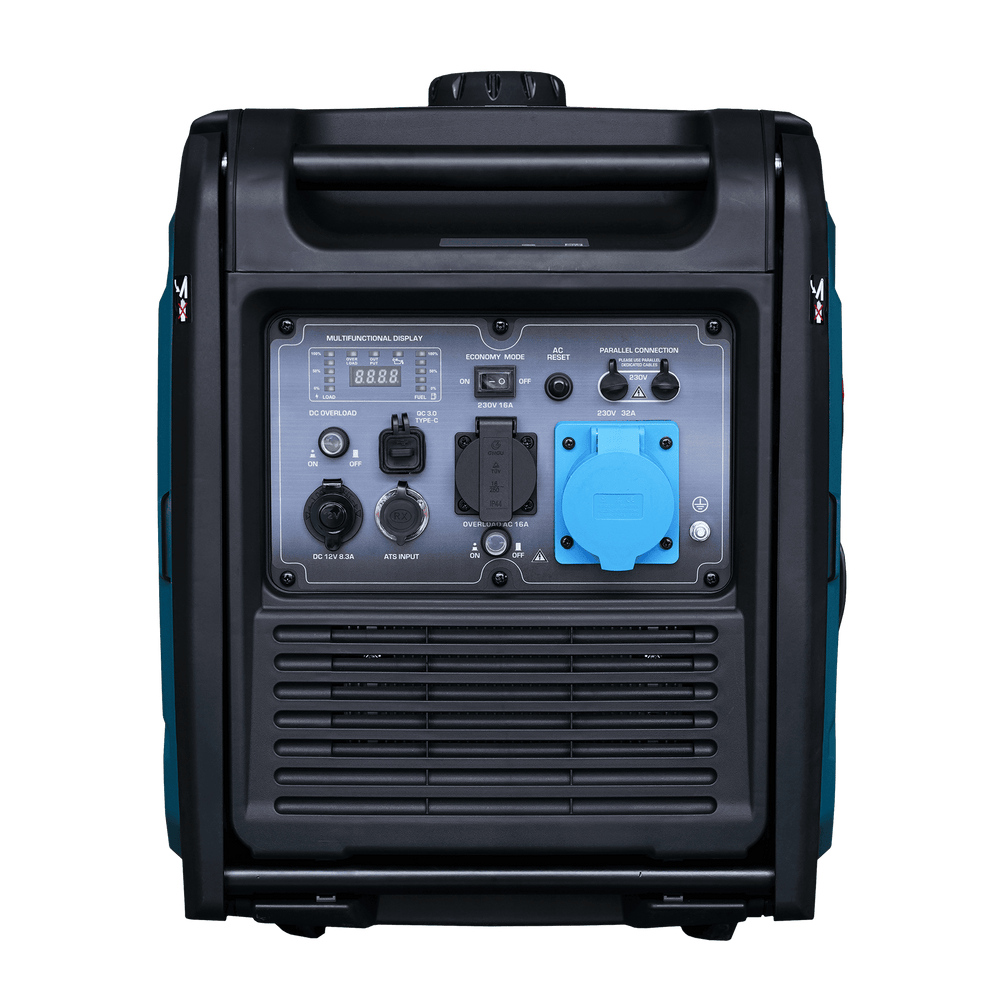 Convenient location of all functions: multifunction LED display (hour meter, frequency, voltage), working mode indicator, overload and short circuit protection, low oil level sensor, Reset button to reset the control system and restore voltage supply, connector for parallel connection of generators, two USB outputs (5V/1A, 5V/2.1A), 230 V socket and grounding terminal.