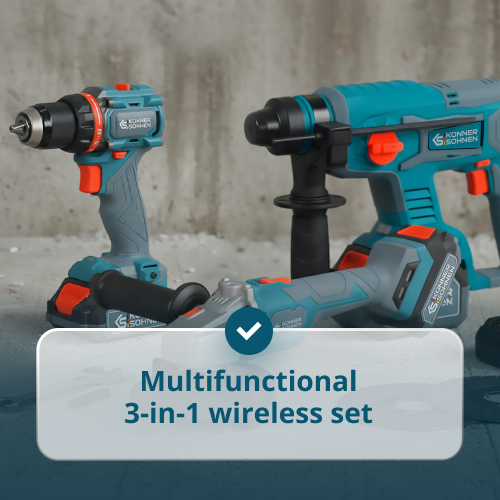 • Multifunctional cordless 3-in-1 set in a convenient bag – three tools in one kit: drill, angle grinder, and rotary hammer with 2 batteries and a fast charger in a convenient bag for various household tasks.