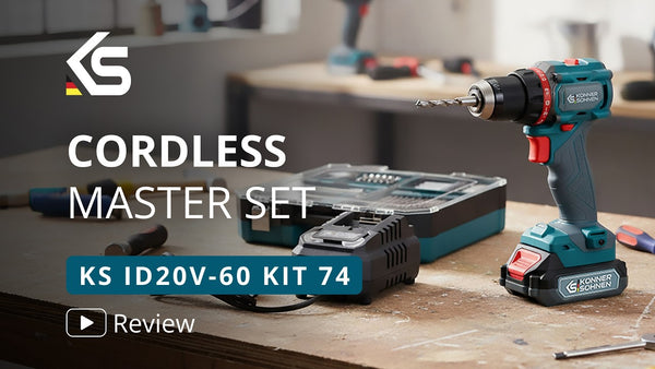 KS ID20V-60 KIT 74 ir instrumentu komplekts koferī, kas ietver bezvadu triecienurbjmašīnu, 74 gabalu piederumu komplektu — uzgaļus, urbjus un stiprinājumus, 2 Ah akumulatoru un 2,4 A lādētāju. Urbjmašīnai ir trīs darbības režīmi: urbšana, skrūvēšana un triecienurbšana (28,500 bpm), kas ļauj urbt metālu vai koku, savukārt divi ātrumi un 23 griezes momenta iestatījumi nodrošina precizitāti jebkuram uzdevumam. Bezsuku motors nodrošina līdz 60 Nm griezes momentu, darbojas klusi un efektīvi. Ērtai lietošanai tas ietver gumijotu rokturi, LED gaismu un jostas cilpu. Drošības sistēma ietver aizsardzību pret pārkaršanu, pārslodzi un pārmērīgu izlādi.