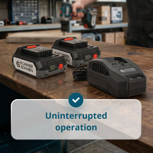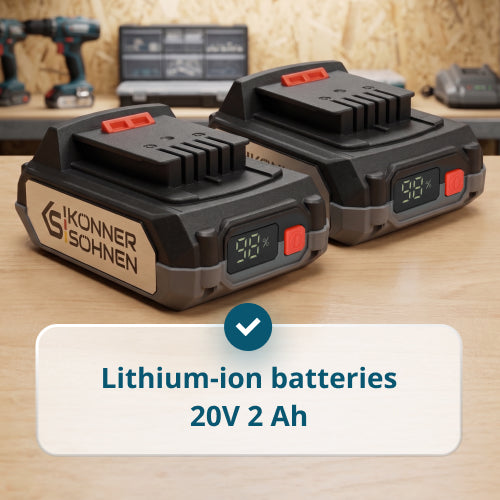 Divas baterijas ievērojami palielina darba efektivitāti: viena tiek izmantota, otra tiek uzlādēta. Tas ļauj samazināt dīkstāves laiku un nodrošina komfortu ilgstošu uzdevumu laikā. Baterijām ir kompakti izmēri un mazs svars — tikai 0.47 kg katra, kas padara instrumentu ērtāku lietošanā.