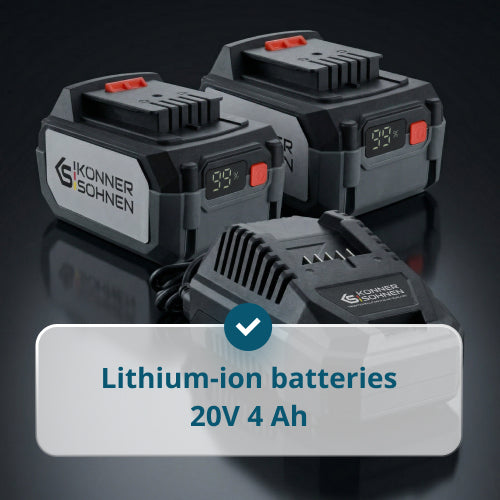 KS 20V4-1-DUAL starta komplekts ir paredzēts tiem, kam nepieciešams nepārtraukts un efektīvs darbs ar KS 20V bezvadu instrumentiem. Komplektā ietilpst divi litija jonu akumulatori ar katra ietilpību 4 Ah un lādētājs ar strāvu 4,5 A, kas nodrošina stabilu un ātru uzlādi. Pilnas akumulatora uzlādes laiks līdz 65 minūtēm.