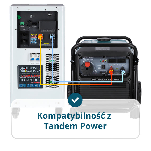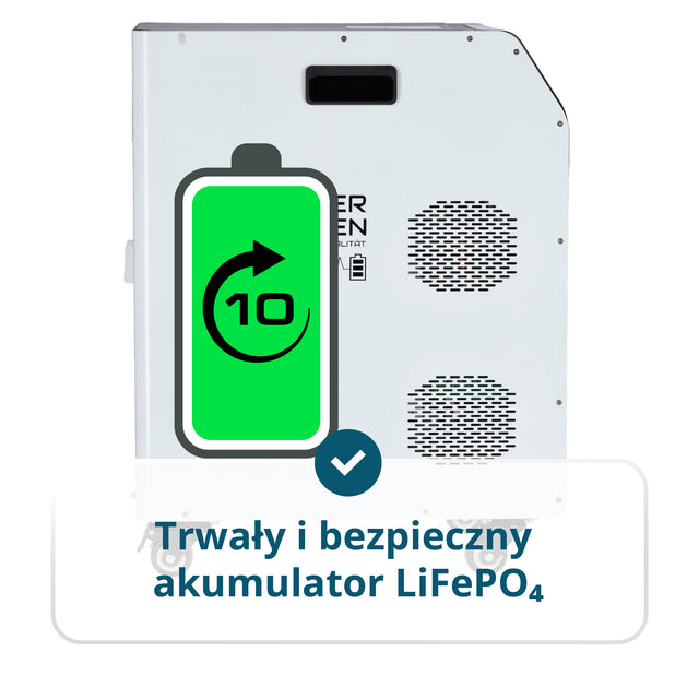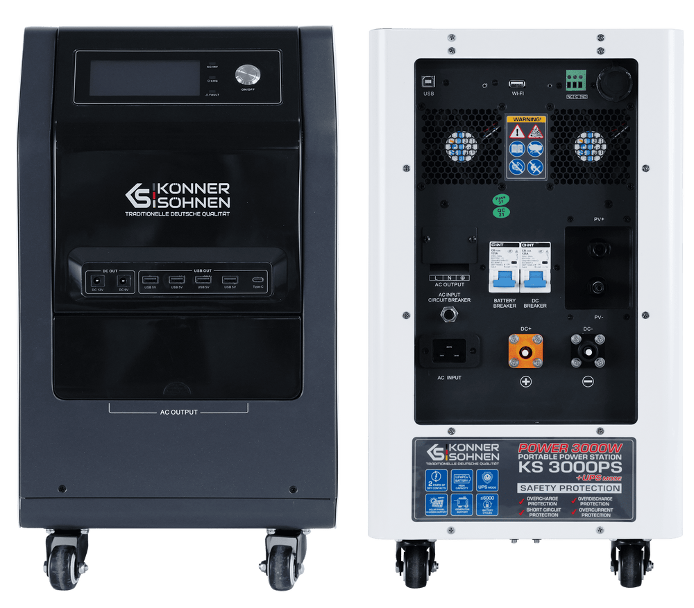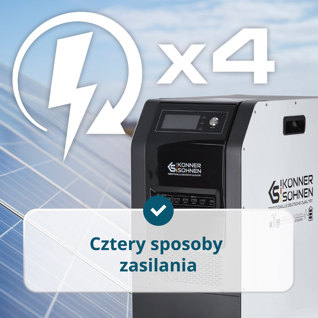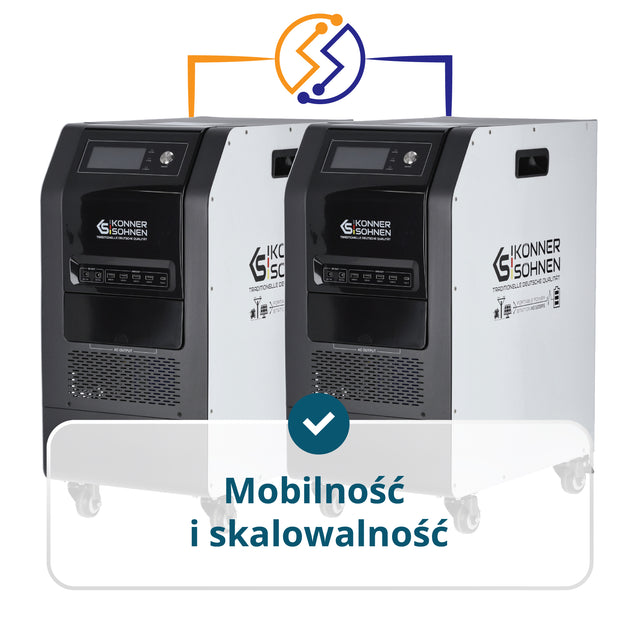 Wyjście 24V DC do generatora lub akumulatora, Inwerter z „czystą” sinusoidą, LiFePO₄ 3,2 kWh, Kontroler MPPT, UPS < 10 ms, Obsługa Tandem Power, Szybkie ładowanie do 80% w 1 godzinę, Zabezpieczenie przed przeciążeniem i przegrzaniem, Wyświetlacz LCD do monitorowania parametrów, Koła i uchwyty do transportu |