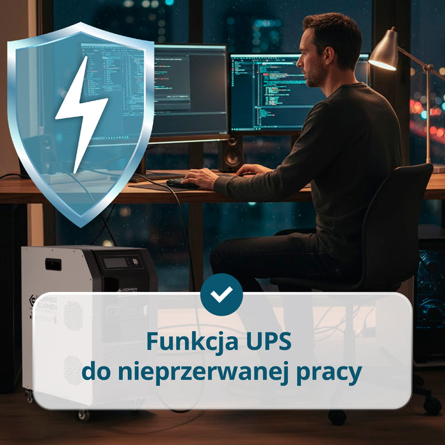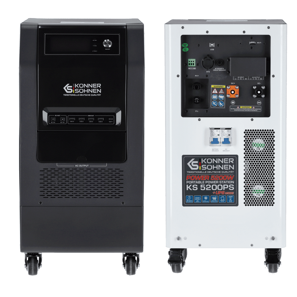 Wyjście 48V DC dla generatora lub akumulatora, Inwerter z „czystą” sinusoidą, LiFePO₄ 5,12 kWh, Kontroler MPPT, UPS < 10 ms, Obsługa Tandem Power, Szybkie ładowanie do 80% w 1 godzinę, Zabezpieczenie przed przeciążeniem i przegrzaniem, Wyświetlacz LCD z monitorowaniem parametrów, Kółka i uchwyty do transportu |